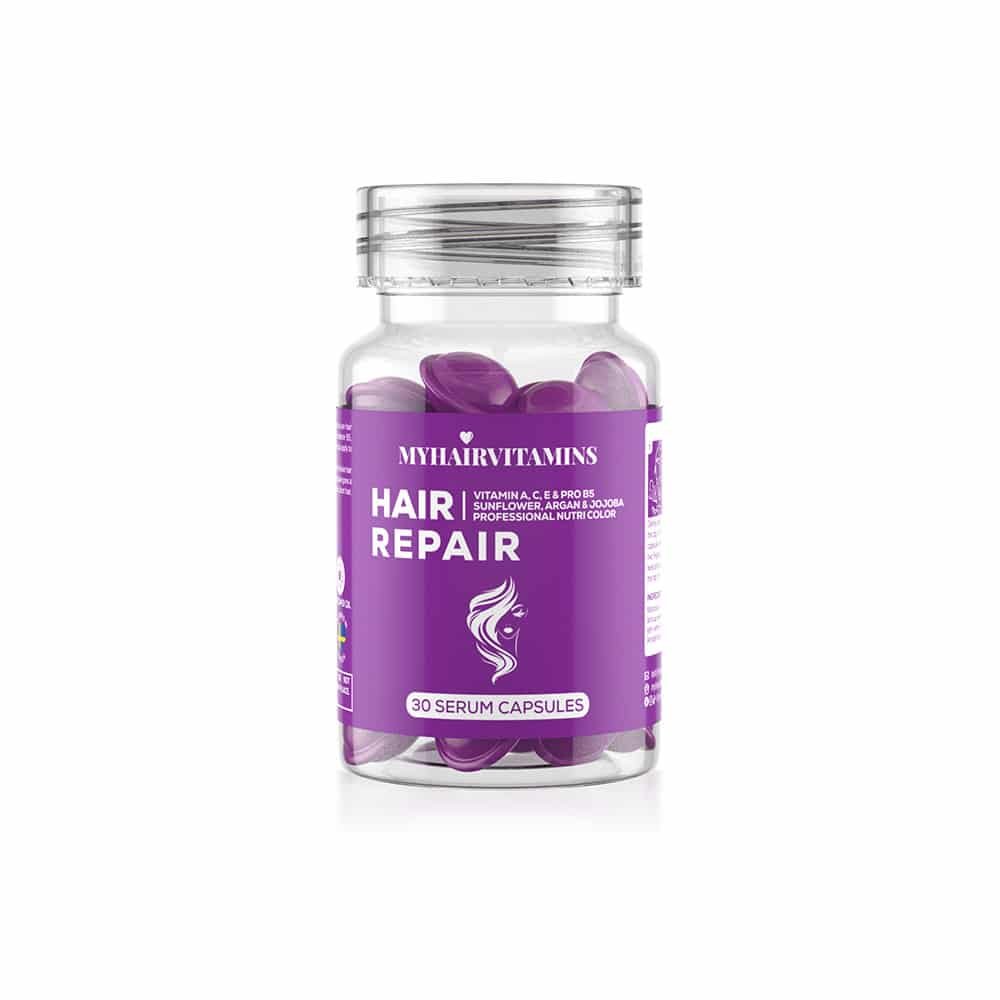 MYHAIRVITAMINS tepami vitaminai pažeistiems plaukams su keratinu HAIR REPAIR vitaminai apsaugo nuo saulės ir kitų aplinkos agresorių, dėl kurių spalva laikui bėgant išblunka. Tepami vitaminai taip pat sustiprina kiekvieną sruogą, naudojant keratino formulę, sumažinamas plaukų lūžinėjimas ir galiukų skilinėjimas, todėl plaukai pastebimai sveikesni.
